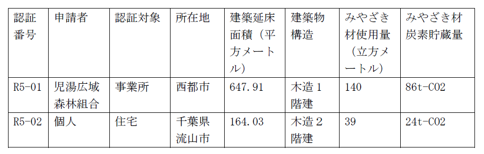みやざき材炭素貯蔵量認証制度認証一覧